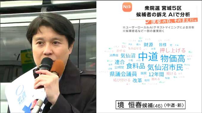中道改革連合の新人・境恒春さんです。最も大きくなったのは、中道改革連合の「中道」。次いで「物価高」や「食料品」でした。