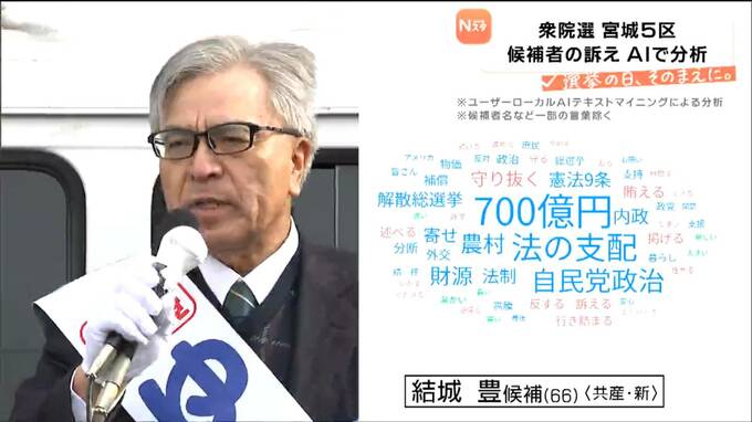 共産党の新人・結城豊さんです。最も大きいのは「700億円」。今回の選挙に投入された税金の額だと批判し「自民党政治」と対決すると訴えました。