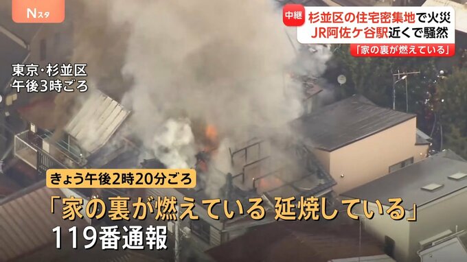 きょう午後2時20分ごろ、東京・杉並区阿佐谷北で「家の裏が燃えている。延焼している」と119番通報がありました。