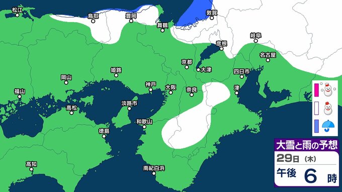 気象庁によりますと、日本付近は強い冬型の気圧配置となっており、近畿地方では、あす(30日)にかけて上空約1500メートルに氷点下9度以下の強い寒気が流れ込む見込みです。