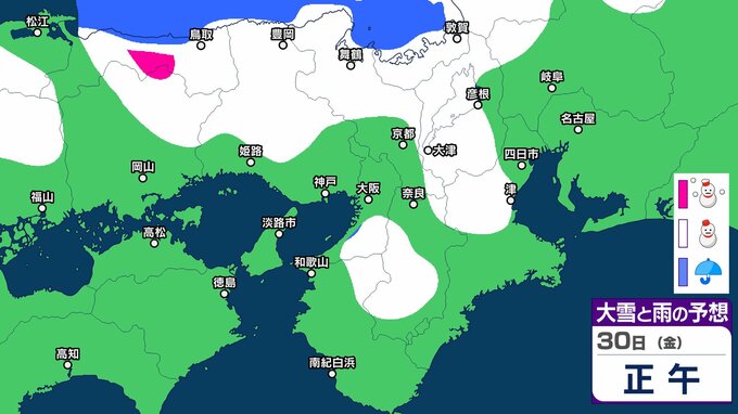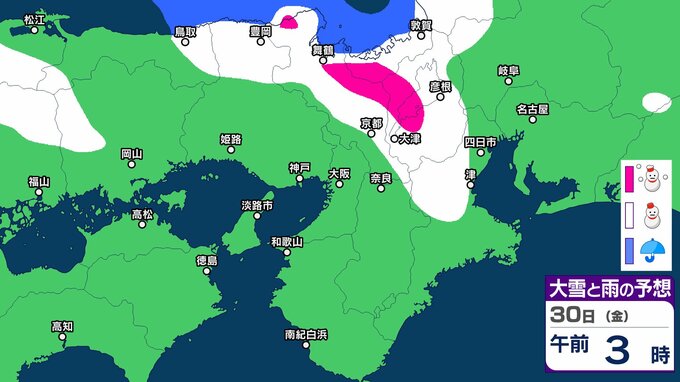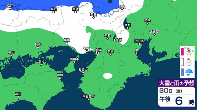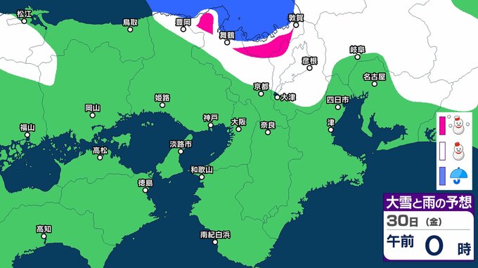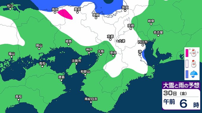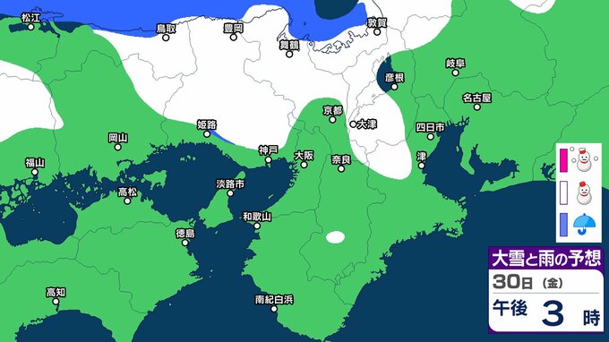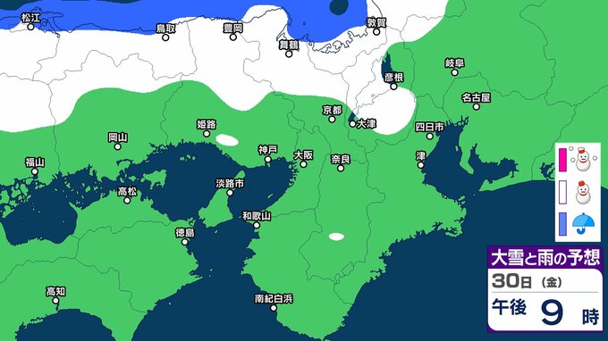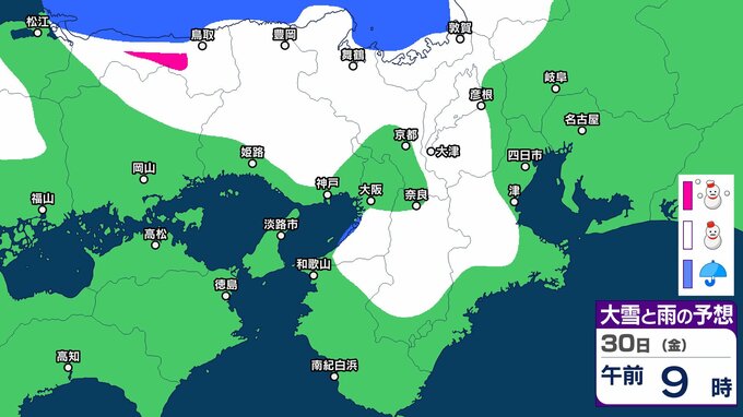 気象庁によりますと、近畿地方ではあす(30日)にかけて、上空約1500メートルに氷点下9度以下の強い寒気が流れ込み、冬型の気圧配置が強まる見込みです。