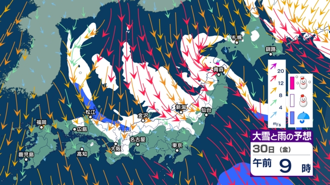 “第2波”ともされる強烈寒波は、30日(金)にかけてピークを迎える見込みです。こうしたなか、29日に気象庁は「大雪に関する全般気象情報 第4号」を発表していて、30日にかけて、北陸地方では大雪や路面の凍結による交通障害に警戒し、東北地方と東日本~西日本では大雪に注意・警戒。また、着雪やなだれに注意するよう呼び掛けています。
