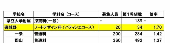 【奈良県公立高校入試2026】一条1.42倍、郡山1.37倍…奈良高校ほか各校の倍率は?宮大工目指す新設コースも【高校受験1月発表 全日制全校掲載 進路希望調査】 毎日放送 2026年1月29日(木) 19:30 国内 進路希望調査≪奈良県の公立高校 倍率トップ3≫ ▼磯城野(フードデザイン科・パティシエコース):1.70倍 ▼一条高校(普通):1.42倍 ▼郡山(普通):1.37倍