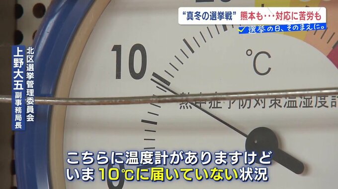 北区選挙管理委員会 上野大五 副事務局長「こちらに温度計がありますけど、いま10℃に届いていない状況。選挙は午前7時から午後8時まで。しかも、熊本では寒い2月ということで、かなり冷えてくるんじゃないか」
