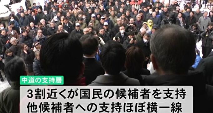 今回の調査では中道の支持層のおよそ3割近くが国民の候補者を支持する一方で、他の候補者への支持はほぼ横一線となっています。