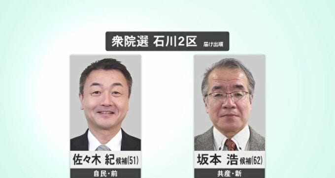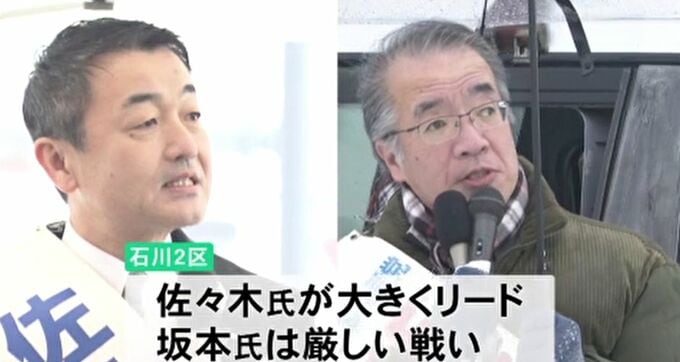 【衆議院選挙・石川情勢分析】「石川1区」・「石川2区」は自民候補がリード 「石川3区」は中道候補がややリード 【選挙の日、そのまえに。】 北陸放送 2026年1月29日(木) 17:50 国内 石川2区は自民・佐々木氏が大きくリード 南加賀を選挙区とする石川2区には 自民党の前職・佐々木紀候補。 共産党の新人・坂本浩候補が出馬しています。 佐々木さんが大きくリードし、坂本さんは厳しい戦いとなっています。