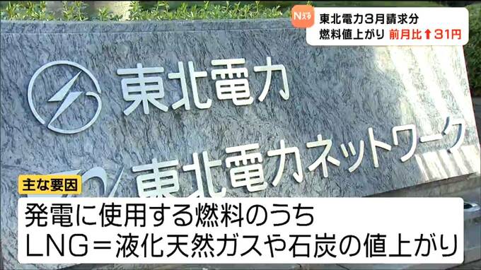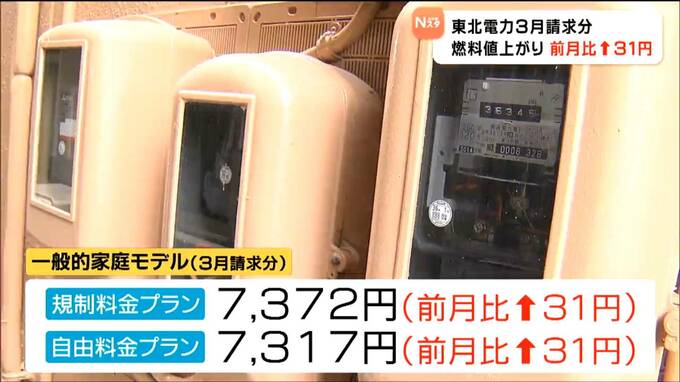 東北電力によりますと、3月請求分の一般的な家庭のモデルの電気料金は規制料金のプランで7372円、自由料金のプランで7317円と、どちらも2月請求分より31円上がります。