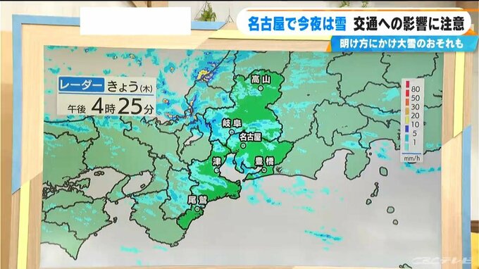 きょうは日本海から雲が流れ込み、東海3県の平地も含めて広く雪や雨が降っている状況です。名古屋や岐阜などは、雨やみぞれが降っているという所がほとんどですが、このあと夜までには雪に変わるところが多くなりそうです。