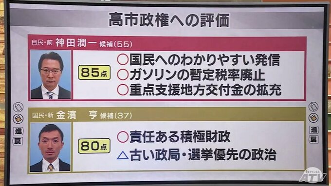 自民党の前職・神田潤一 氏(55)は、「85点」としています。