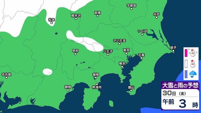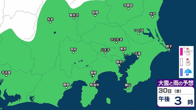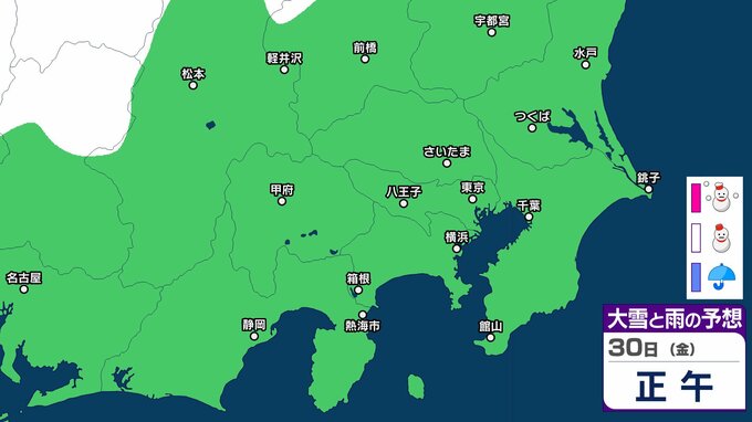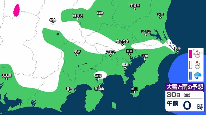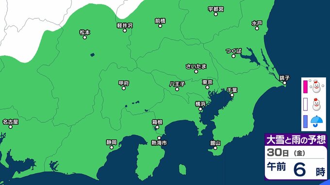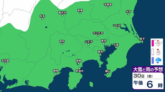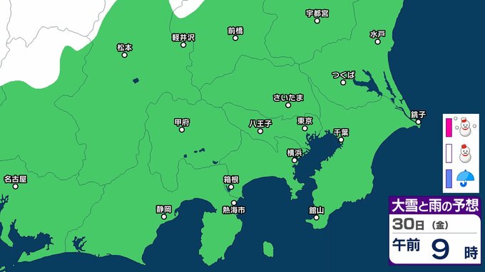 気象庁によりますと、30日の関東甲信地方は、冬型の気圧配置が続きますが、気圧の谷や湿った空気の影響を受ける見込みです。このため、晴れや曇りで、雪や雨の降る所があり、明け方まで雷を伴う所があるでしょう。
