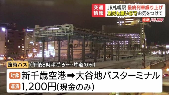 JRの運休を受けて、新千歳空港を管理する北海道エアポートは、空港内での利用者の滞留を防ぐため、提携先のバス会社に要請し、新千歳空港から大谷地バスターミナルまでの臨時バスを運行しました。