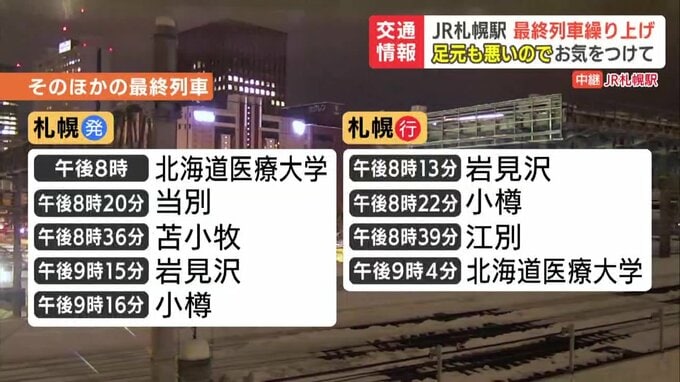 岩見沢行きと小樽行きはともに午後9時すぎ、学園都市線の北海道医療大学行きは午後8時ちょうどが最後です。