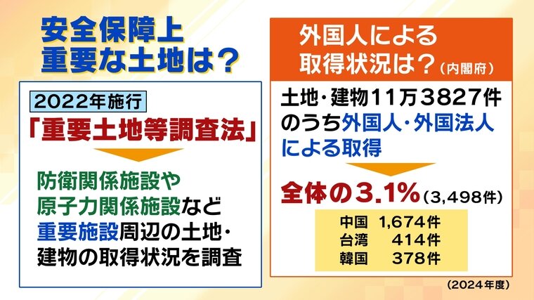 内閣府によると、土地・建物11万3827件のうち、外国人・外国法人による取得は「全体の3.1%(3498件)」だということです(2024年度)。