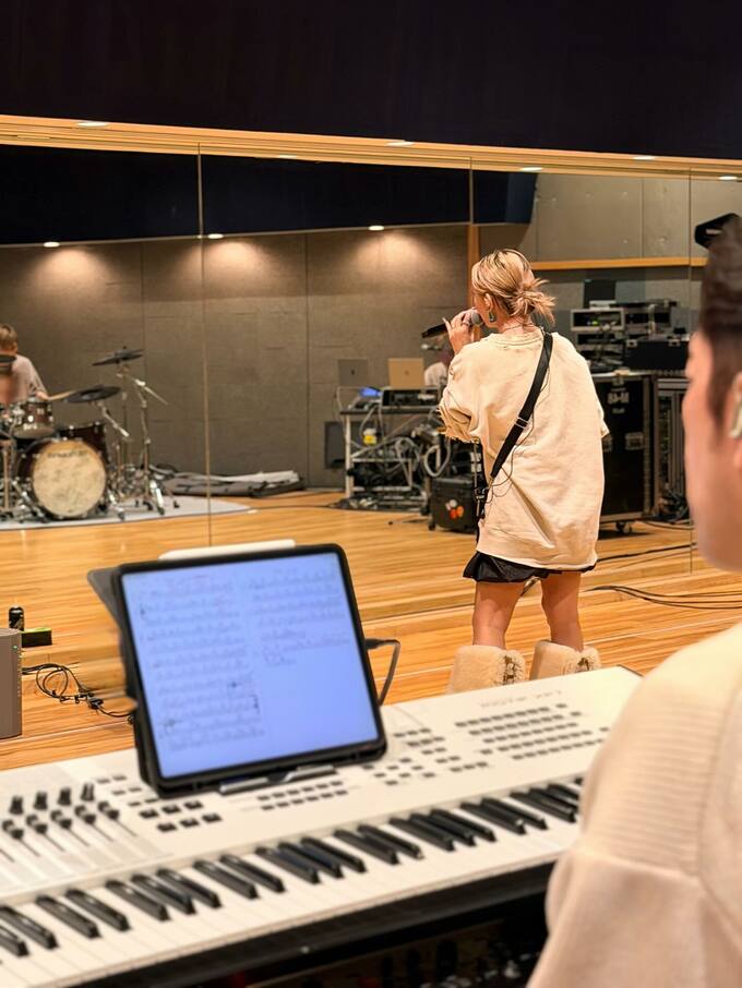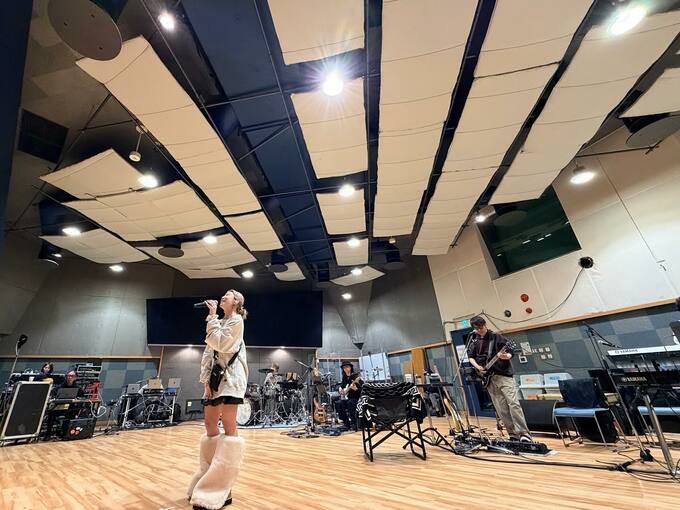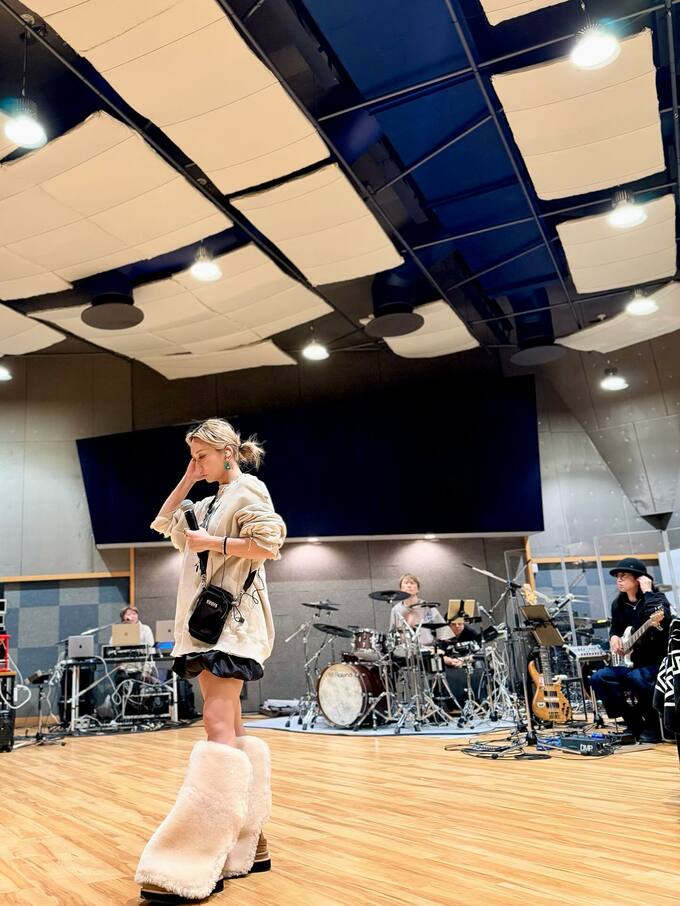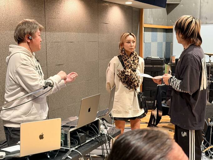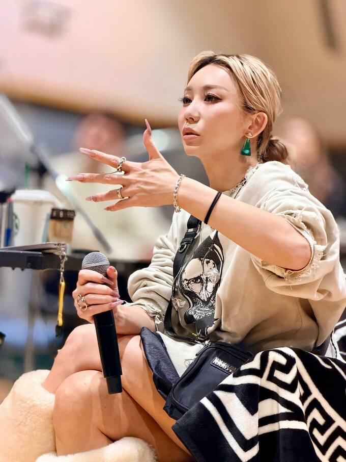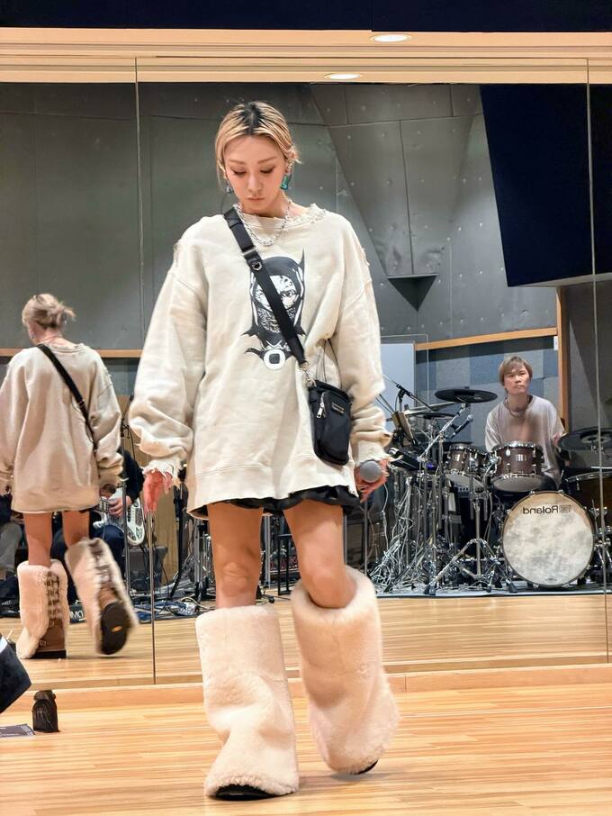 公開された写真では、ベージュのオーバーサイズトップスに黒のミニスカート、白いファー付きブーツを身にまとった倖田さんがマイクを手に歌唱する姿が映されています。バンドメンバーを背景に、真剣な表情で練習に取り組む様子が伝わってきます。