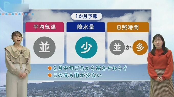 【気象情報】あす30日も冬型続く PM2.5で空は霞み… 来週ようやく寒さ和らぐか 野母崎では水仙が見頃 長崎放送 2026年1月29日(木) 18:46 国内 「雨が少ない」… 発表された1か月予報では、平均気温は平年並みで、2月中旬頃から寒さが和らぐ見通し。しかし、降水量は少ない予想となっています。 秋からすでに雨が少ない状態が続いているため、日頃からの節水を心がけてください。