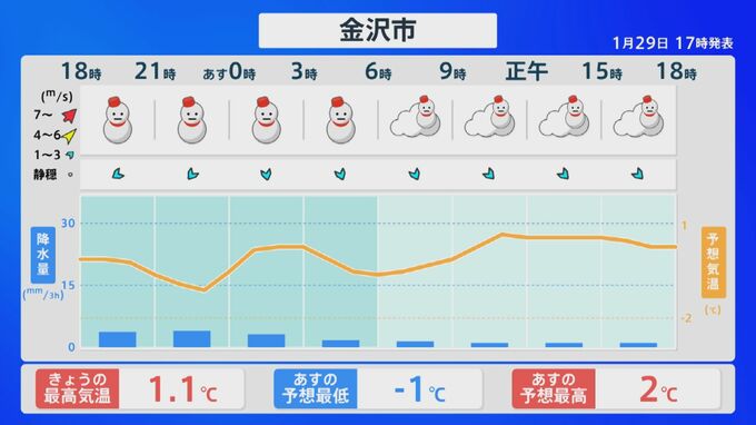 30日は金沢は未明は雪の降り方が強まり、その後も北陸には北西の風が吹き雪の降りやすい状態が続くでしょう。