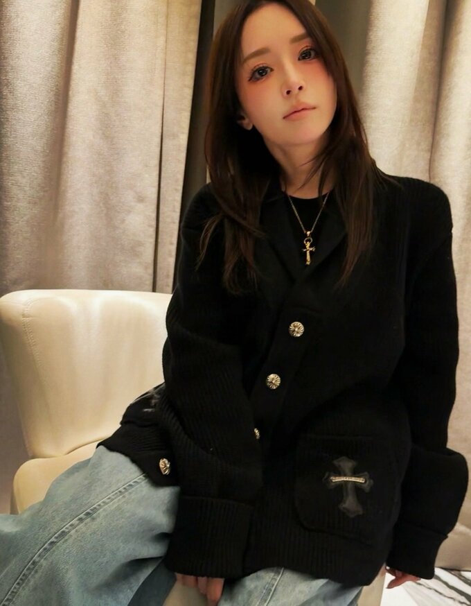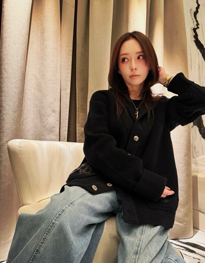 浜崎さんは、黒のニットカーディガンに金の十字架のネックレスを合わせ、淡いブルーのワイドデニムを履きこなしたラフなコーディネートを披露。椅子に腰掛け、リラックスした表情を見せています。
