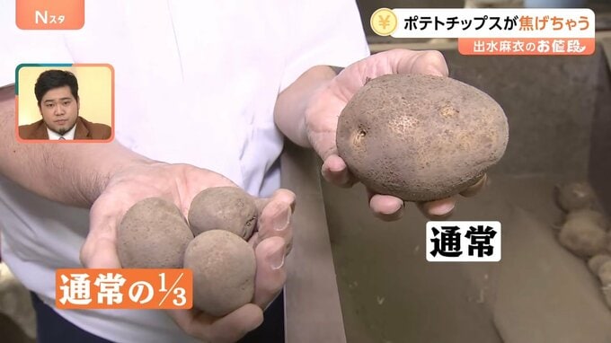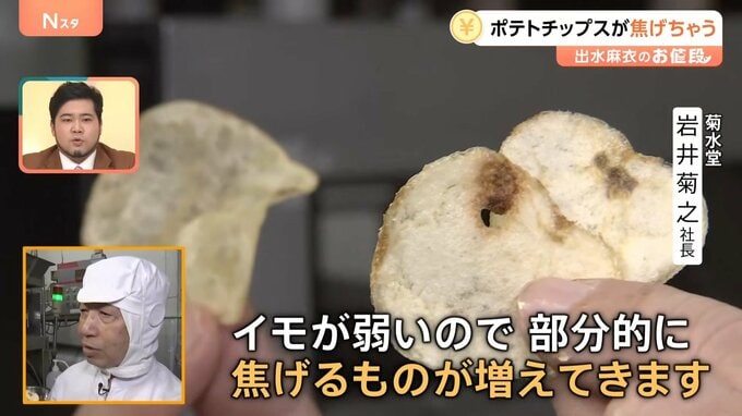 「いま揚がっているポテトチップをとりました。小さなものが大変多くなっている。大きいかなと思っても小さめ。小ぶりなジャガイモが大変多い。イモが弱いので、部分的に焦げるものが増えてきます」