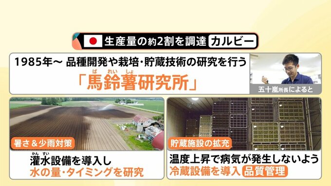 さらに、日本で生産されているジャガイモの約2割を調達している「カルビー」では、1985年から「馬鈴薯研究所」を設立し、品種改良や栽培・貯蔵技術の研究を行っています。