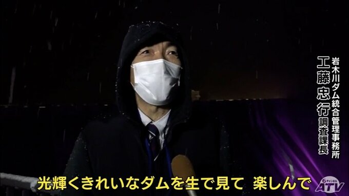 また、午後5時55分から1時間に1回、虹色に染まる演出で冬の津軽ダムを幻想的な雰囲気に包み込みます。