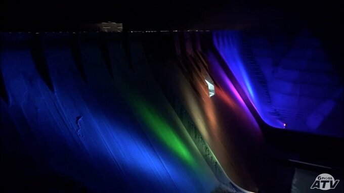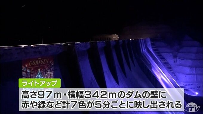 西目屋村の津軽ダムで始まったクリスマスのライトアップ。これはダムを身近に感じてほしいと企画されたもので先ほど、午後4時半にダムの壁に色鮮やかな光が映し出されました。ライトアップは高さ97メートル、横幅342メートルのダムの壁をスクリーンに、赤や緑、黄色など全部で7色の光が映し出され、5分ごとに色が変化します。