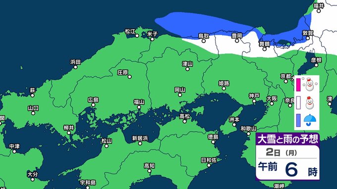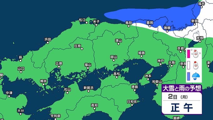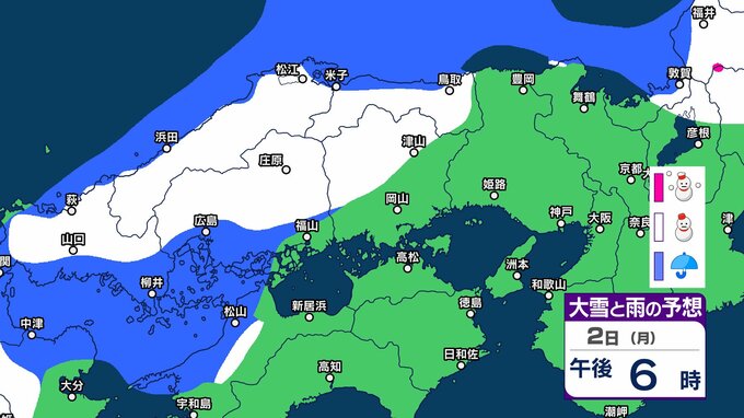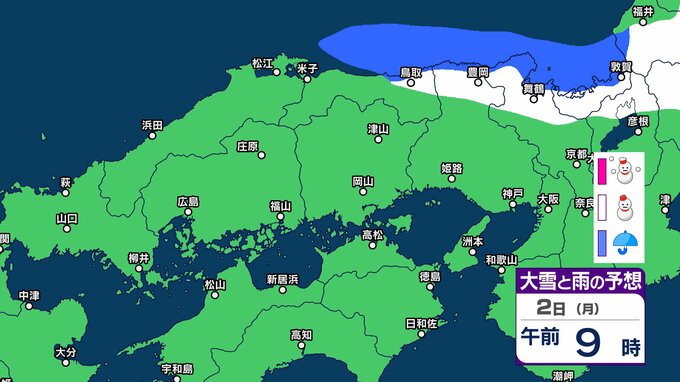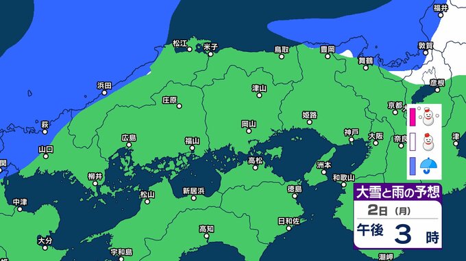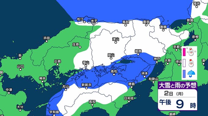 【雪】中国・四国地方の今後の雪は? 広島・岡山・山口・鳥取・島根・香川・愛媛・高知・徳島 2月3日(火)までの雪雨シミュレーション【気象庁 30日】 RSK山陽放送 2026年1月30日(金) 11:06 国内 天気 2日(月) 2日夜から3日午前にかけて前線が通過するため、中国地方、四国地方に雪雲が広がるでしょう。 22 23 24 25 26 27 28 29