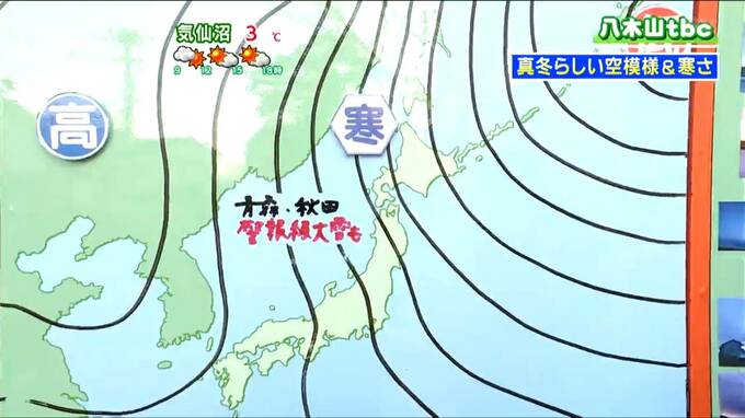 予想天気図を見ると、西高東低の、まさに教科書に出てくるような冬型の気圧配置が続いています。上空の寒気は30日までがピークと見られ、東北地方では青森県や秋田県で警報級の大雪となるおそれもあります。宮城県では大雪になることはないと見られますが、西部の山沿いでは雪の降りやすい状態が続くでしょう。