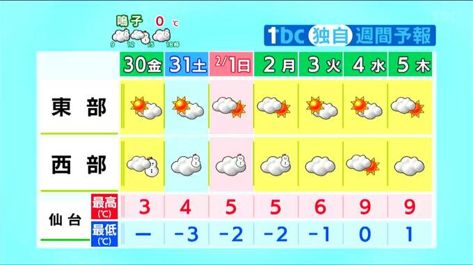 来週の見通しとしては、東部では曇りや晴れの日が多く、西部では月曜日まで雪が降りやすいですが、そのあとは冬型の気圧配置が緩んできますので、水曜日を中心に少し日差しも届きそうです。寒気もだんだん弱まってきますので、寒さも徐々に緩んでいき、水曜日、木曜日は3月上旬から中旬並みの気温まで上がってくるでしょう。