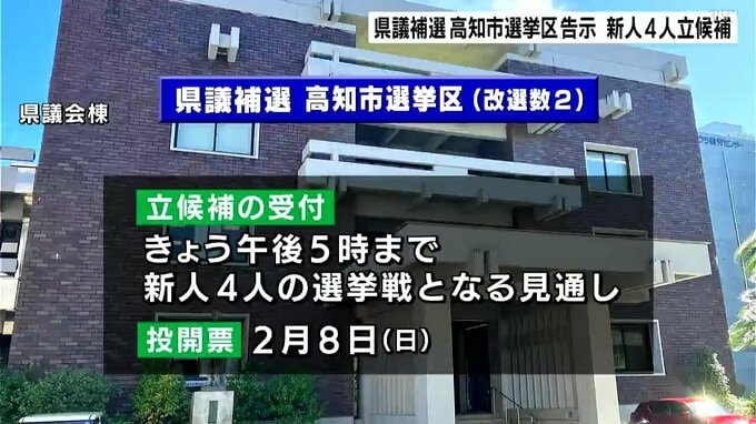 現職の辞職に伴う高知県議会高知市選挙区の補欠選挙が告示されました。改選数は2で、これまでのところ新人4人が立候補しています。