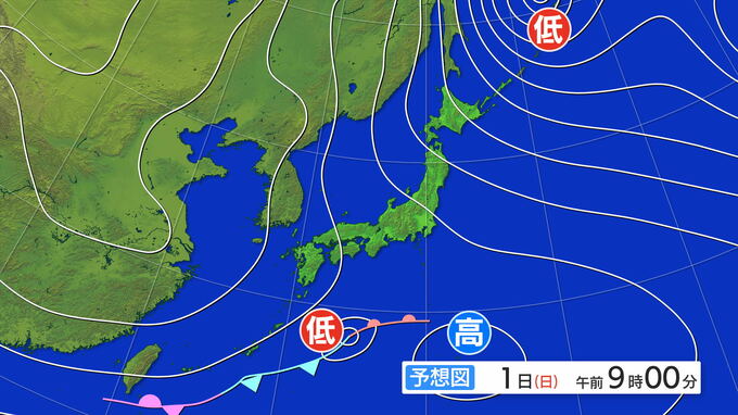 2月1日(日)午前9時では、等圧線の間隔も大きくなり冬型の気圧配置も少しゆるんできそうです。