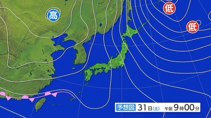 31日(土)午前9時の予想天気図です。日本海の東部では等圧線が縦にのびていて、北陸より北では北西の風が強いでしょう。