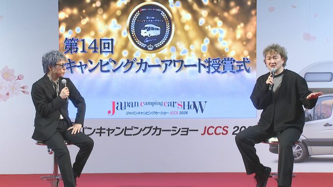ジャパンキャンピングカーショー2026が千葉・幕張メッセで開催され、歌舞伎俳優の中村獅童さんが第14回キャンピングカーアワードを受賞。前回の受賞者・田村淳さんも登壇し、家族で過ごすキャンピングカーライフについて対談しました。