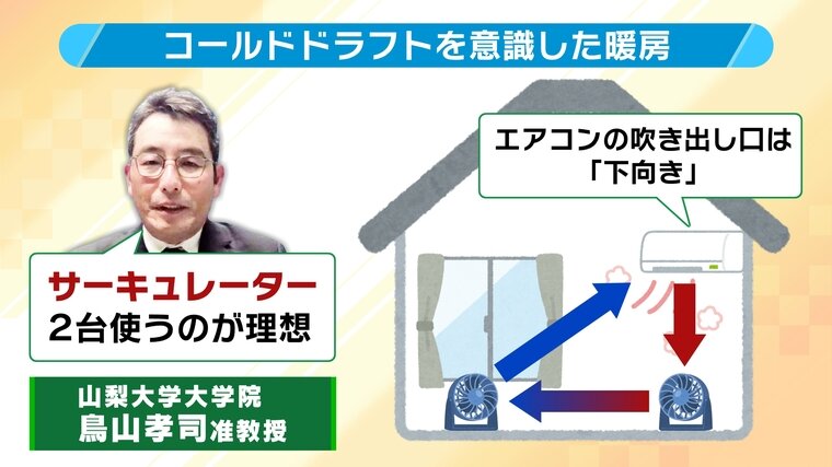 コールドドラフトの対策として、熱工学の観点から最も効率がいいのは「エアコン」だと鳥山准教授は指摘。さらにサーキュレーターを2台使うのが理想だと言います。