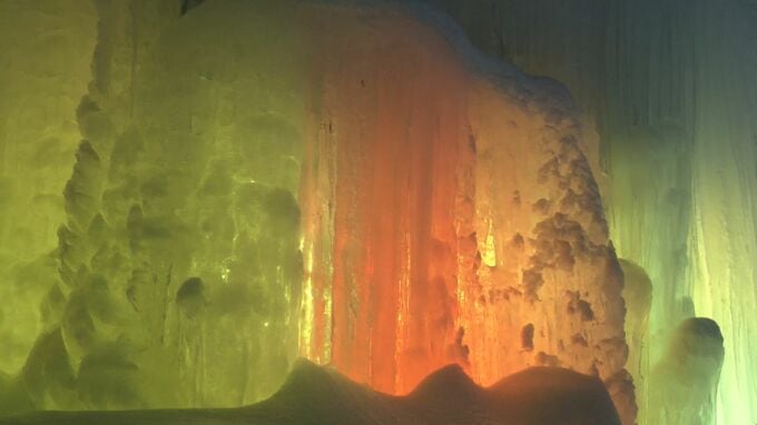 「氷点下の森」 七色の光が作り出す幻想的な景色 巨大な氷の柱をライトアップ 2月末まで 岐阜・秋神温泉