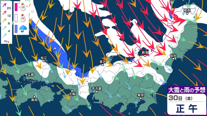 気象庁が30日(金)に発表した「大雪に関する全般気象情報 第5号」によりますと、30日の日本付近は強い冬型の気圧配置であるほか、強い寒気が流れ込んでいて、さらに日本海は気圧の谷となって雲の広がりやすい状態になっているということです。