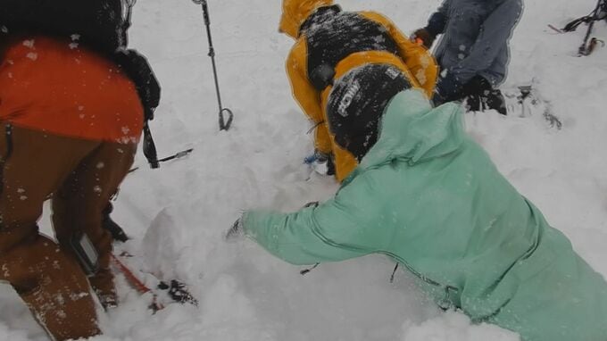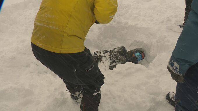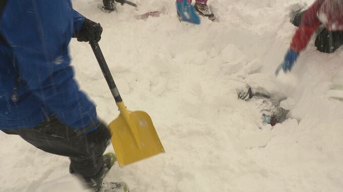 専門家などを講師に招き、登山やスキーなどで冬山を楽しむ人を対象に毎年行われています。雪が積もった斜面で行われる実地訓練は、全国的にも例が少ない取り組みです。雪崩に巻き込まれる危険を理解するため専門家立ち合いのもと、記者が雪に埋めてもらうことに。