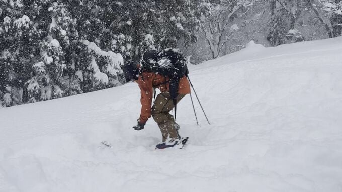 北陸地方雪崩講習会 田中誠さん「Zのようにジグザグに切りながら信号をどこで拾うか。信号を拾ったらビーコン上に距離と方向が出てくるのでそこに向かって進む。3メートルほど近づいたらそこからはビーコンをひざ下まで落として進み、表示される距離が一番短くなるところを探すとその付近に埋まっている」