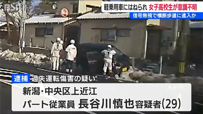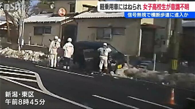 新潟市 東区の県道で30日、横断歩道を歩いていた女子高校生が軽乗用車にはねられ意識不明の重体となっています。軽乗用車が信号無視をしたとみられ、警察は運転していた男を現行犯逮捕しました。