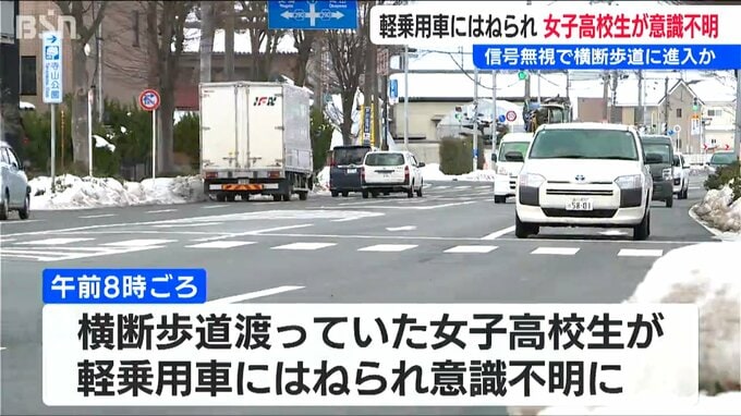 警察によりますと、30日午前8時ごろ横断歩道を渡っていた女子高校生が軽乗用車にはねられ、意識不明の重体となっています。