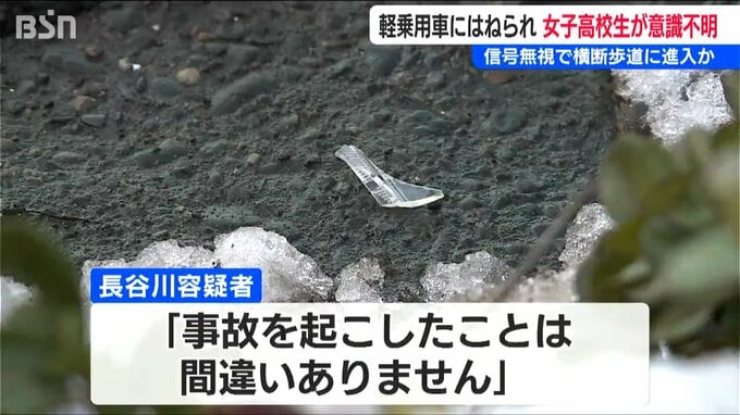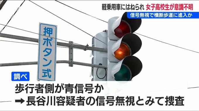 現場は通称『赤道』と呼ばれる県道で、信号は歩行者側が青だったとみられ、警察は長谷川容疑者が赤信号を無視して交差点に入ったとみて、事故の原因を詳しく調べています。