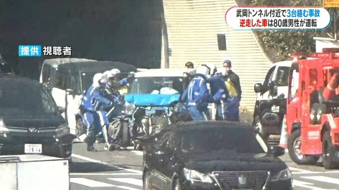 鹿児島市の武岡トンネルの出口付近できょう30日車が逆走しました。3台がからむ事故が発生し、3人が搬送されました。