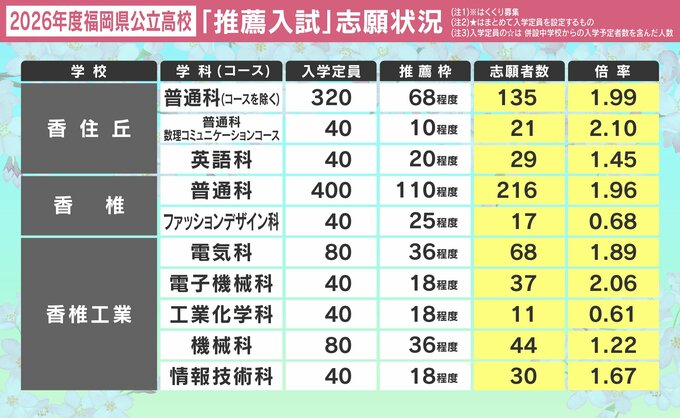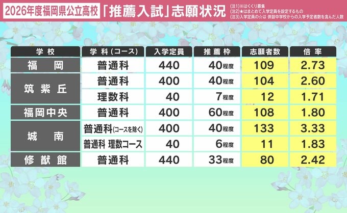 【福岡県公立高校入試2026】推薦・特色化選抜 志願状況全校掲載 各学校の志願倍率、最も高いのは「3.38倍」明善・普通科総合文科コース RKB毎日放送 2026年2月2日(月) 16:00 国内 2026年度推薦入試志願状況一覧