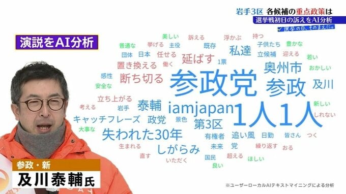 参政党・新人の及川氏は、党のアピールやキャッチフレーズの説明に時間を割きました。既成政党の議員を退場させ、しがらみを断って国民に政治を取り戻すとアピールしました。