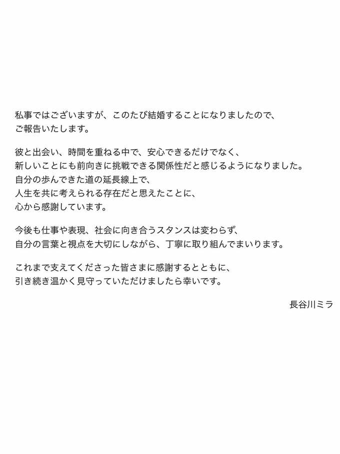 タレント・モデルで、ラジオパーソナリティとしても活躍している長谷川ミラさんが、結婚したことを報告しました。