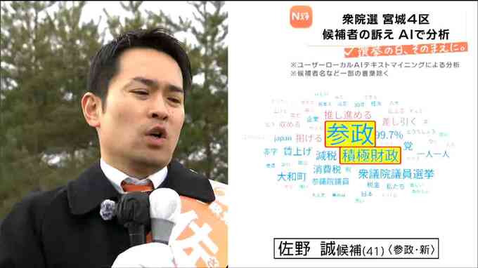 最も大きく表示されたのは自身が所属する党名の「参政」。次いで大きくなったのは公約として掲げる「積極財政」でした。