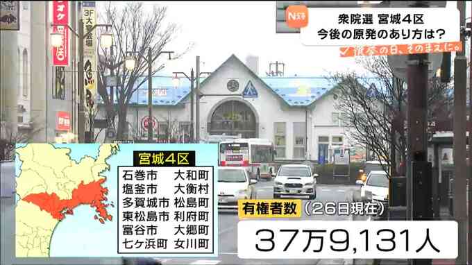 宮城4区は石巻市や塩釜市それに富谷市など12の市町村からなり、有権者数は37万9000人余りです。