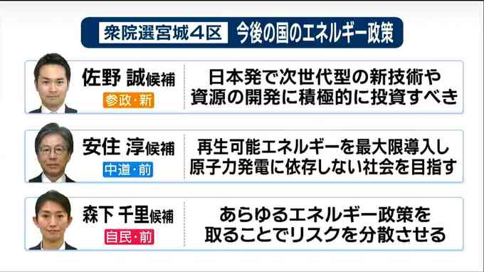 中道改革連合の前職、安住淳さんは、新党を組んだ公明党が目指す社会と考え方がもともと一致しているとして「再生可能エネルギーを最大限導入し原子力発電に依存しない社会を目指す」と答えました。