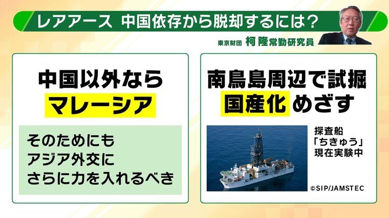 また、柯隆氏は「南鳥島周辺で試掘、国産化を目指す」方向も提案。現在、探査船「ちきゅう」が実験中です。