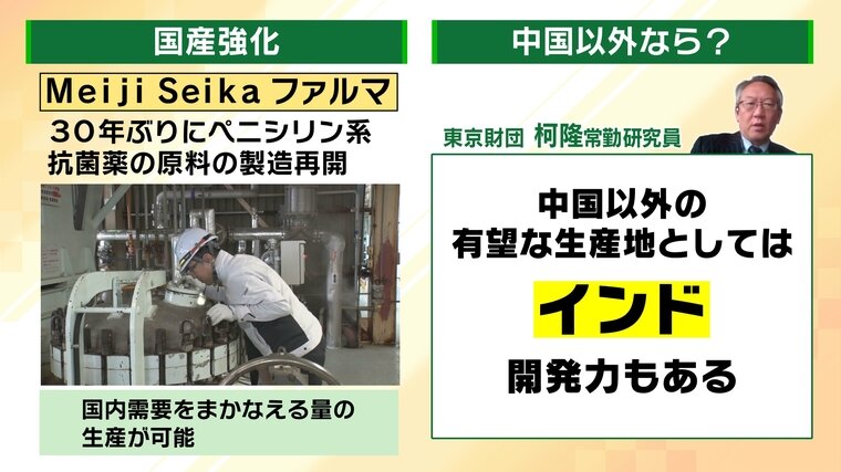 その1つが、国産の強化です。Meiji Seikaファルマは、30年ぶりにペニシリン系抗菌薬の原料の製造を再開しました。国内需要をまかなえる量の生産が可能だということです。
