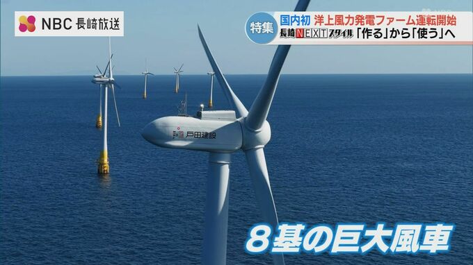 五島市・崎山沖の海上で、冬の風を受け力強く回る8基の巨大な風車。 海面からの高さは約170メートル。最大の特徴は、この巨大な構造物を海底に固定せず、海の上に浮かせる「浮体式」であることです。